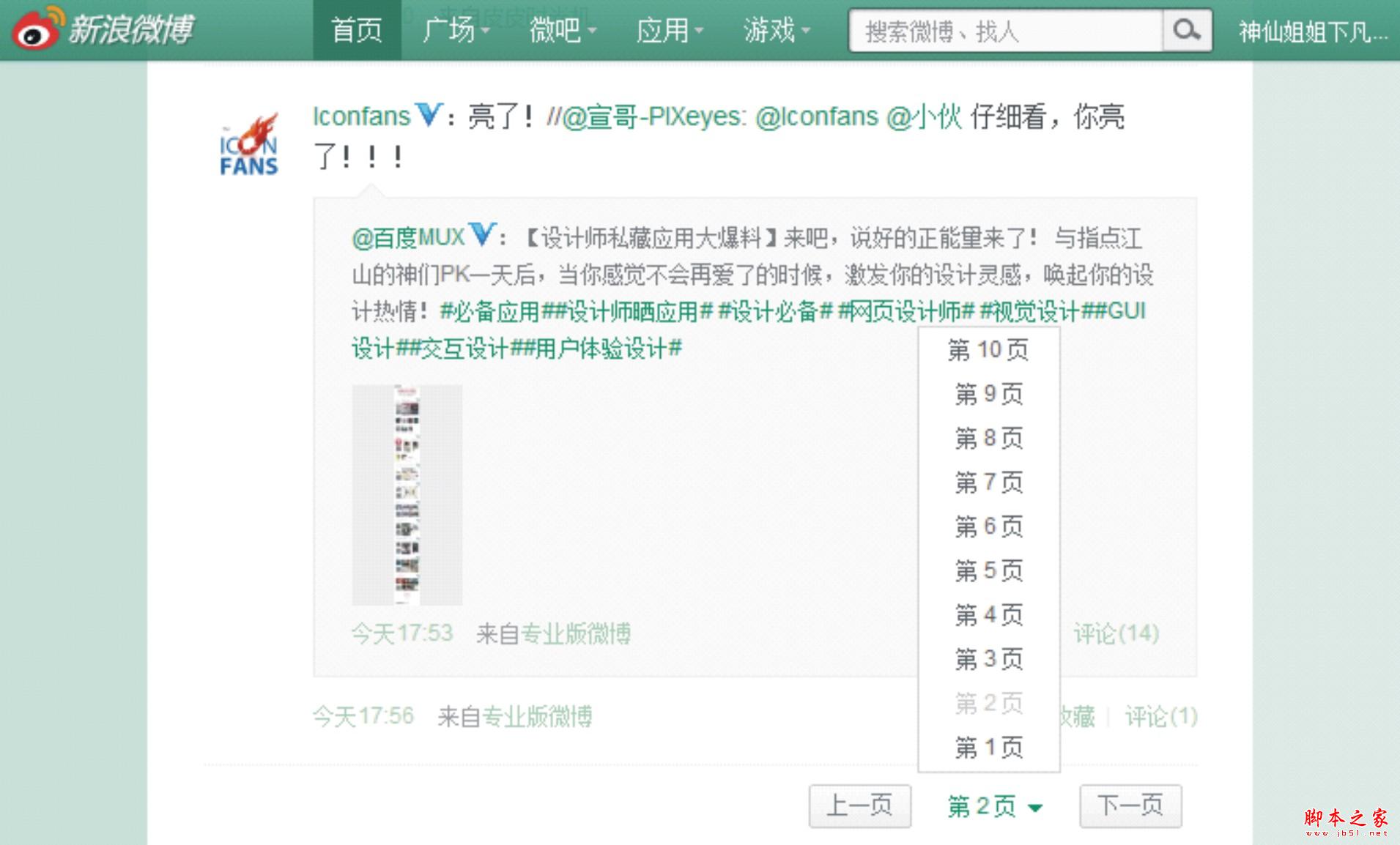 用户浏览的信息是关注的信息,会像读报纸一样逐页的浏览下去,因此"上一页""下一页"用的次数最多;其次是跳转翻页,为体现轻量微博的概念,将传统翻页的中间页码部分简化成下拉菜单,既能标识当前页位置又能翻页切换跳转;