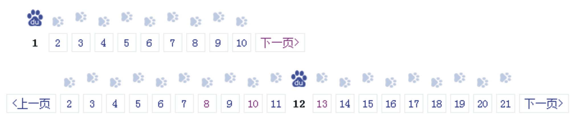 1.搜索结果首次只提供10个页码;一般用户在这10页内还没找到想要的内容应该会更换搜索内容。脚印图形和下面页码对应都可点击翻页,增加了页面趣味性