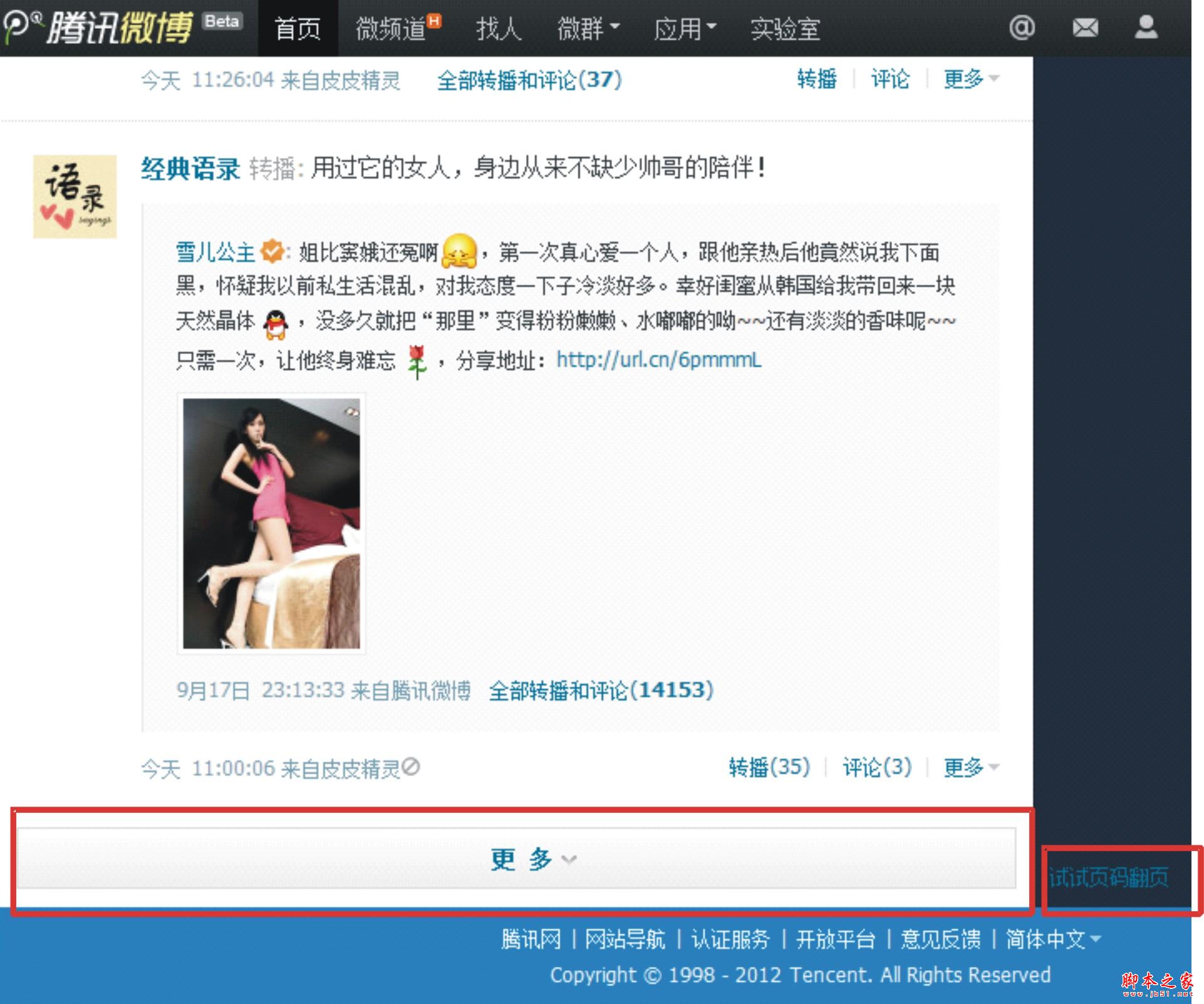 1.腾讯weibo:一页45条微薄,更多默认显示更多按钮,点击后下面又多显示45条,以此类推;同时腾讯还推出页码翻页模式供用户选择