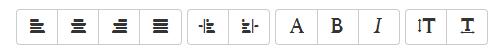 <div class="btn-toolbar"> <div class="btn-group"> <button type="button" class="btn btn-default"><span class="glyphicon glyphicon-align-left"></span></button> <button type="button" class="btn btn-default"><span class="glyphicon glyphicon-align-center"></span></button> <button type="button" class="btn btn-default"><span class="glyphicon glyphicon-align-right"></span></button> <button type="button" class="btn btn-default"><span class="glyphicon glyphicon-align-justify"></span></button> </div> <div class="btn-group"> <button type="button" class="btn btn-default"><span class="glyphicon glyphicon-indent-left"></span></button> <button type="button" class="btn btn-default"><span class="glyphicon glyphicon-indent-right"></span></button> </div> <div class="btn-group"> <button type="button" class="btn btn-default"><span class="glyphicon glyphicon-font"></span></button> <button type="button" class="btn btn-default"><span class="glyphicon glyphicon-bold"></span></button> <button type="button" class="btn btn-default"><span class="glyphicon glyphicon-italic"></span></button> </div> <div class="btn-group"> <button type="button" class="btn btn-default"><span class="glyphicon glyphicon-text-height"></span></button> <button type="button" class="btn btn-default"><span class="glyphicon glyphicon-text-width"></span></button> </div> </div>