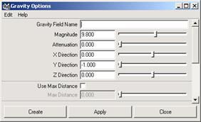重力场主要用于模拟地球的引力,可以使被影响物体的沿固定的方向坠落,这种效果被大量的应用于虚拟显示的环境中。执行 Fields → Gravity □命令,打开如图 10-48 所示的对话框。