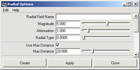 放射力场可以用力模拟磁铁的物理现象,它可以呈放射状的排斥或者吸引被影响的物体。执行 Fields → Radial 命令,打开 Radial Options 对话框,如图 10-53 所示。