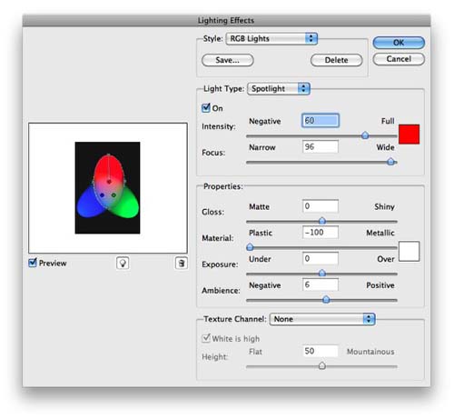 在所有图层上面添加一个新图层,填充白色。点击滤镜>渲染>光照效果。样式选择RGB光,保持其他参数不变。