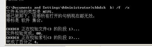 2、在命令提示符窗口上,输入chkdsk K: /f /x