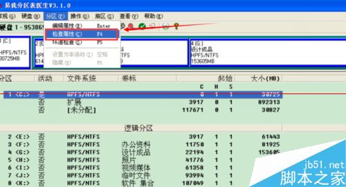2、启动易我分区表医生V3.0后,选择“分区→检查分区”,软件就会提示要E盘进行修复操作,回答“是”就可以将它恢复为NTFS格式并且能够查看里面的文件了。