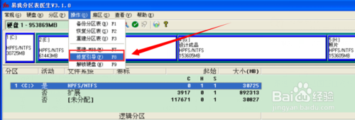 3、如果选择“检查分区”这样的自动操作都无法修复,那就选择交互修复,因为易我分区表医生V3.0修复引导是它的主要功能。只要选择“操作→修复引导”或直接按F8键,然后软件就会对需要修复的分区进行检查,并且在弹出的对话框中选择“是”来进行修复。