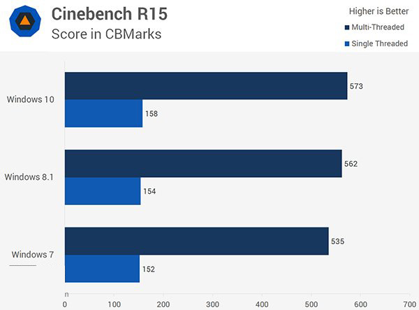一般来说,此项测试会有5%的误差范围,在上图的数据处理中已经被计算在内。从这项评比结果来看,Win10比Win8.1稍强一点,但优势并不明显,而相比于Win7而言就更加突出一些。