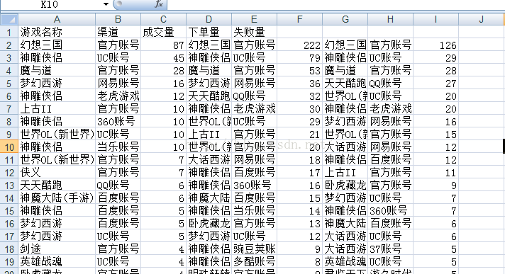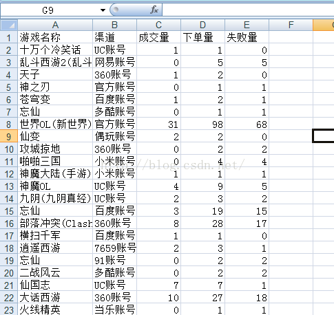 将数据库中每个游戏的成交量、下单量、失败量取出来。写一张如下的表出来: