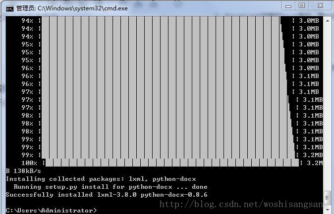 需要注意,python-docx模块安装需要在cmd命令行中输入pip install python-docx,如下图表示安装成功(最后那句英文Successfully installed,成功地安装完成,十分考验英文水平。)
