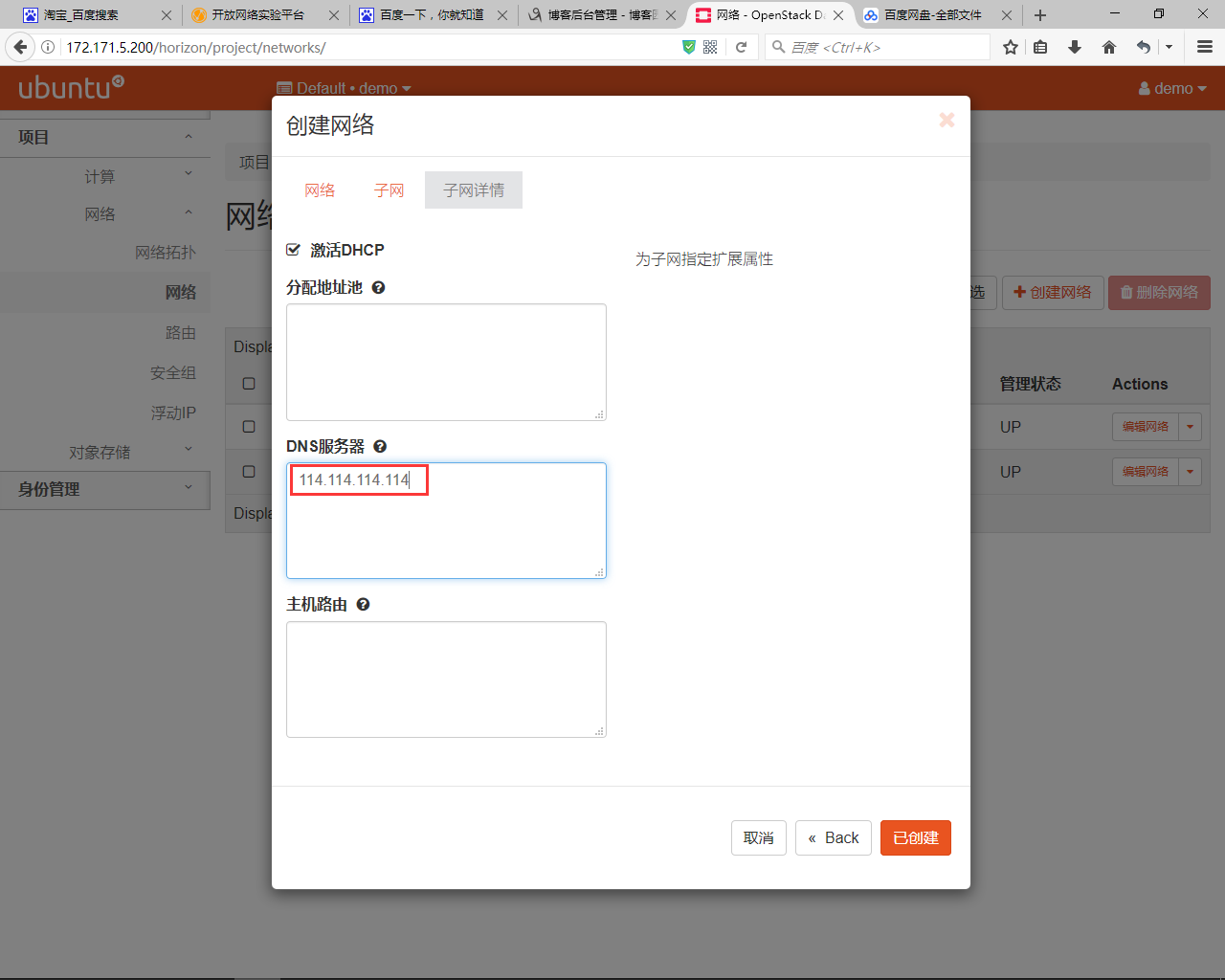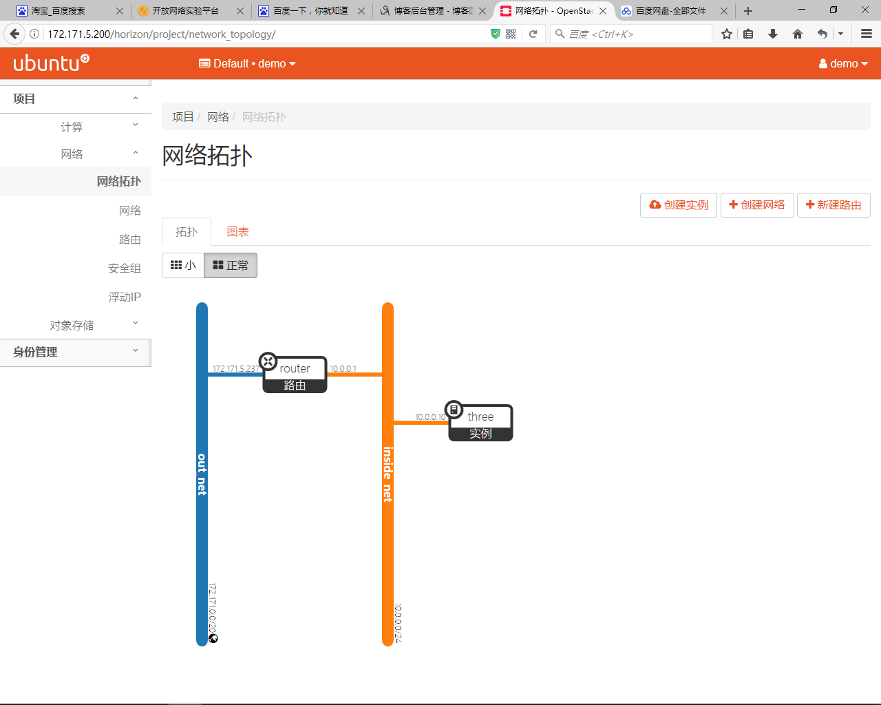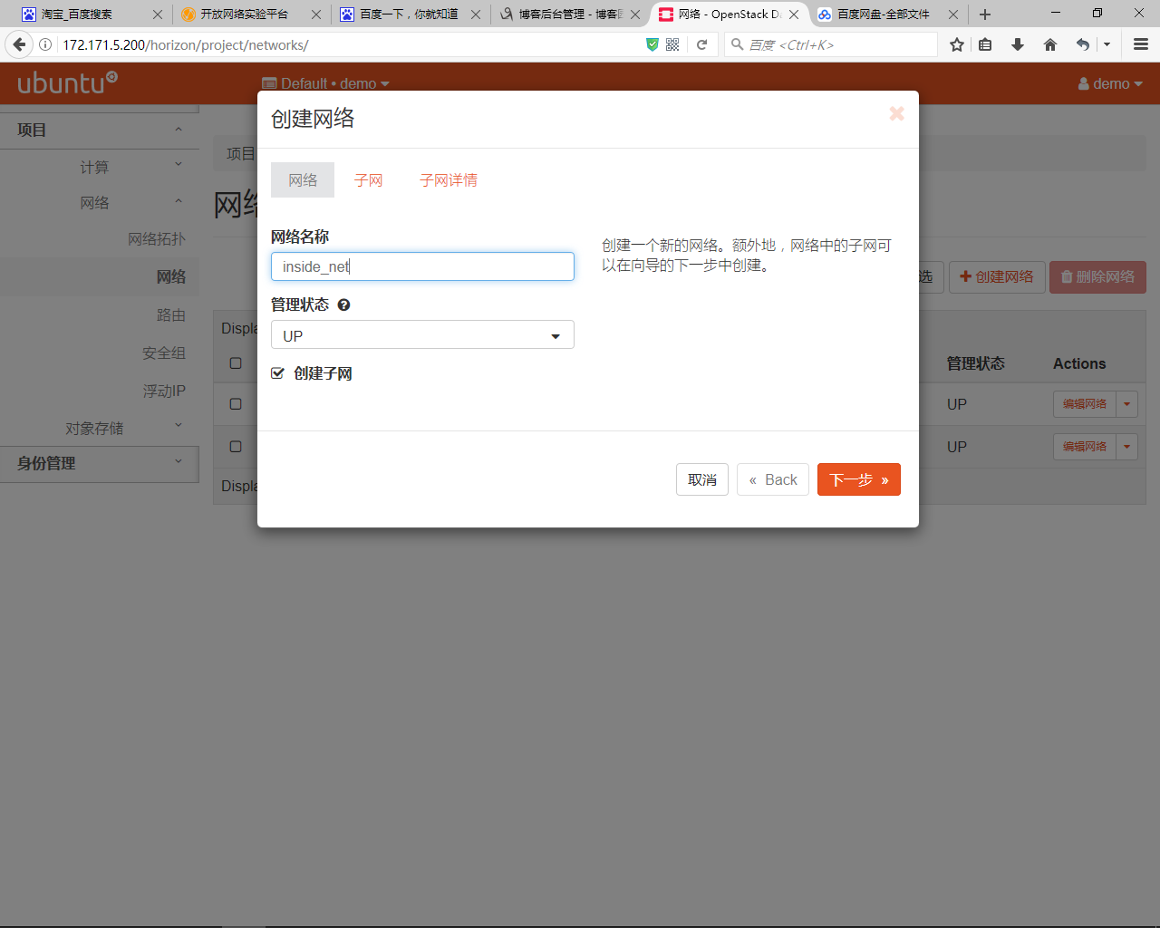2 以demo用户登录,创建内网。因为在后台配置时已经选择了内部网络为vxlan,所以demo用户创建的网络为vxlan。
