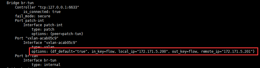 local_ip为本地隧道端点IP地址,remote_ip为对端隧道端点IP地址。本环境是管理网卡为隧道端点,也可以使用单独的网卡。