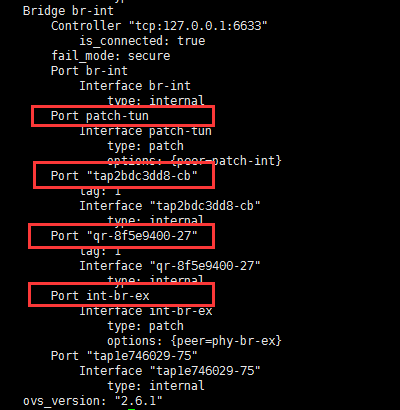 下图为controller节点的端口信息,第一个为controller上br-int与br-tun的连接;第二个是dhcp的设备;第三个是dashboard中创建的路由器的一端;第四个是br-int与br-ex的连接。