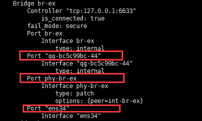 下图为controller节点的br-ex网桥,三个端口分别是:
