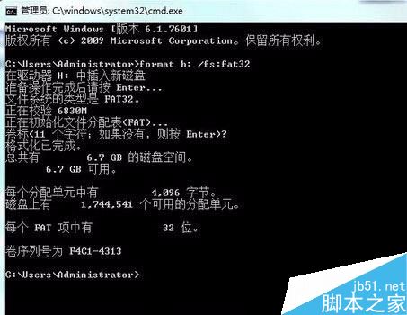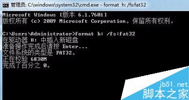 2、在打开的命令窗口中,输入“format g: /fs:fat32”(g为u盘磁盘盘符),回车确认进入下一步操作,如图:
