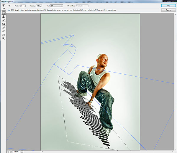 现在,制作开始变得有趣了。为了能够复制出所有的消失平面,也为了保持正确的透视关系,我使用了消失点滤镜来观察人物所骑乘的平面。在这一步上我们需要充分的考虑,因为你没有参照物来确定这个平面在现实中究竟是怎样的。经过几次尝试后,我如下图那样做了设置,觉得这应该可行。做这一步设置,要执行 滤镜>消失点 。