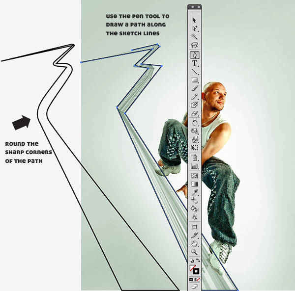 返回Illustrator,用钢笔工具沿着线稿周围创建路径。然后,圆滑那些转角。圆滑这些转角最容易的方法是使用一种叫做“圆滑所有转角”的脚本,点击这里获取脚本(这个脚本的效果可以简单地用圆角滤镜代替,执行 效果>风格化>圆角 —— 译者注)。点击这里了解更多内容。