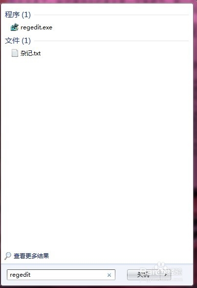 先单击“开始”,在空框里输入“Regedit”(不包括外侧引号)如图(也可以win键+R,弹出运行程序再输入“Regedit”);接着单击“确定”按钮打开注册表编辑器