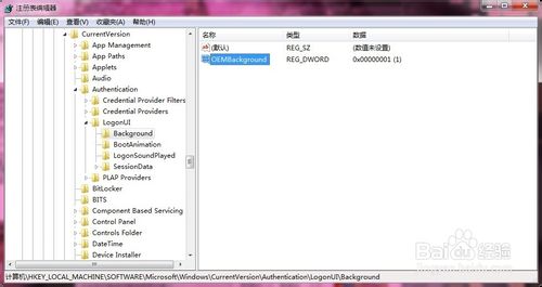 然后再定位到“HKEY_LOCAL_MACHINE/SOFTWARE/Microsoft/Windows/CurrentVersion/Authentication/LogonUI/Background”分支下;大家会发现有一个名为“OEMBackground”的双字节值(如果没有,可自己新建一个),最后右击该双字节值,选择修改,将其值修改为1。更改OEMBackground的值,若为0则表示不使用OEM背景仅使用Windows默认背景;若为1则表示使用OEM背景