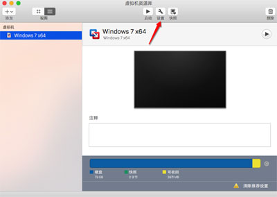 1、在 Mac 上选择想要设置共享文件夹的虚拟机,点击“设置”按钮,如图所示: