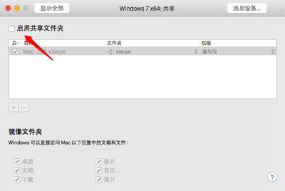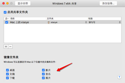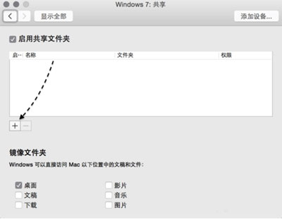 7、如果你想要共享多个文件夹的话,可以在虚拟机的共享设置窗口中添加即可。虚拟机默认为我们提供 Mac 上的桌面、文稿、音乐、图片等共享选项,如果你要想添加其它文件夹的话,请点击“+”按钮,如图所示