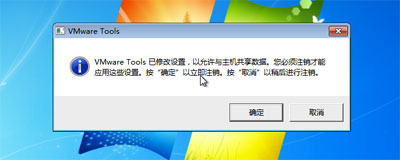 5、接下来我们启动虚拟机,进入系统以后 Vmware Tools 工具提示我们检测到有与主机的共享文件夹,需要注销才能使用,点击“确定”按钮继续。