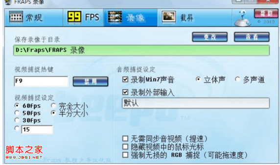 然后打开Fraps,把录像部分设置成这样,如图: 注意:“音频捕捉设定”中,“录制外部输入”要勾选上。