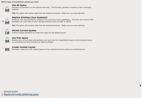 there we choose Replace Existing Linux System->next