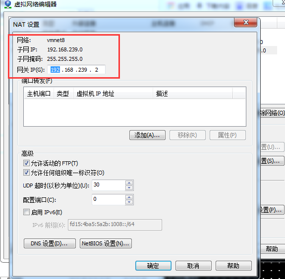 Then choose VMnet8->'NAT设置'->