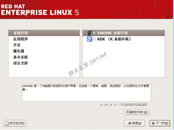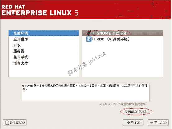 桌面环境这一项,只选择“GNOME桌面环境”,选中“GNOME桌面环境”,点开下方“可选的软件包”,把没勾上的全勾上。如图24所示。