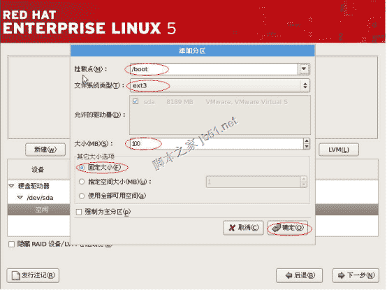 首先新建一个分区,挂载点为“/boot”,文件系统类型为“ext3”,大小为默认的“100”MB,点击“确定”,如图11所示。