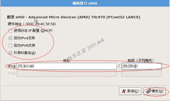 点击“编辑”,弹出编辑接口eth0界面,去掉“使用动态IP配置(DHCP)”和“启动IPV6支持”前的勾勾,然后根据实际情况填写IP地址和子网掩码,如图17所示。