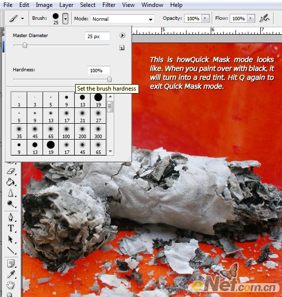 5.点击工具栏里的“以快速蒙版模式编辑”,然后使用“画笔工具”,设置画笔硬度为100%大小为25px,在烟灰上涂抹。
