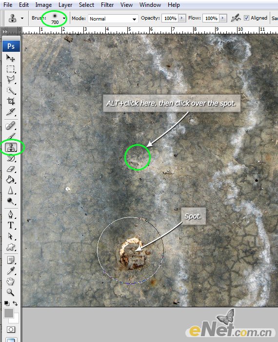 7.载入“混凝土”图片放到背景层上面,使用“图章工具”按住Alt键用鼠标在图的上部所示位置取样,然后将下部位置修复成和上部一样的颜色。