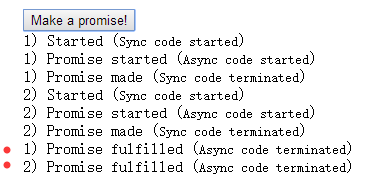 log.insertAdjacentHTML('beforeend', thisPromiseCount +') Promise started (<small>Async code started</small>)<br/>');