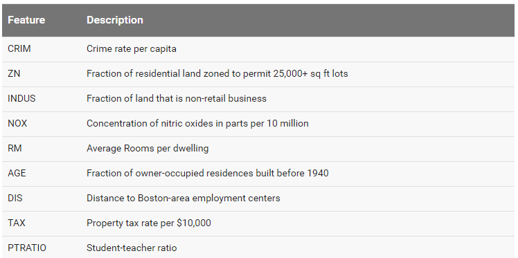 COLUMNS = ["crim", "zn", "indus", "nox", "rm", "age", "dis", "tax", "ptratio", "medv"] FEATURES = ["crim", "zn", "indus", "nox", "rm", "age", "dis", "tax", "ptratio"] LABEL = "medv"