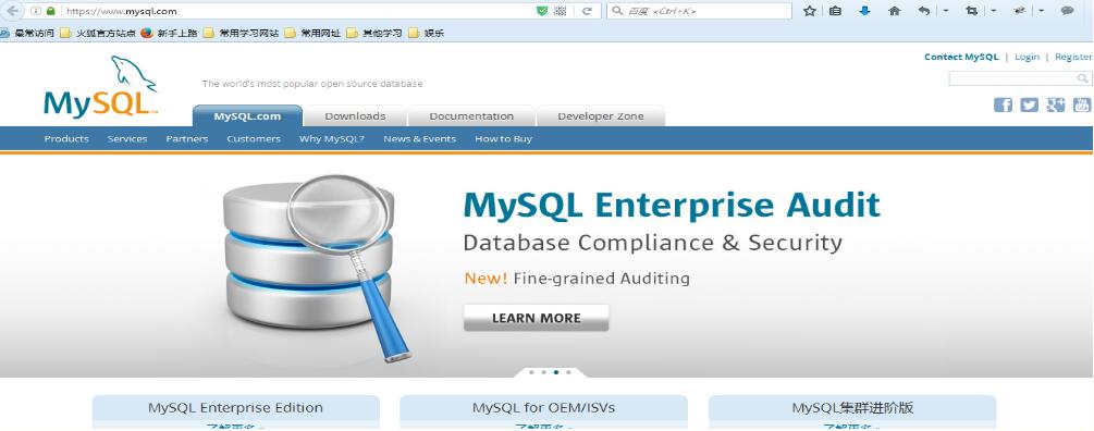 第一步:在浏览器的地址栏输入https://www.mysql.com/ 即进入MySQL官网,如下图所示: