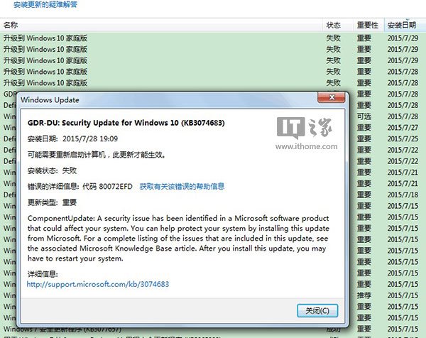 根据此前消息,KB3074683更新是为Win10正式版10240专门推出的安全和功能性更新补丁包,其中包含的补丁总体积超过1GB,用于修复Win10正式版10240制作完成以来的各种已知问题,因此该补丁和Win7可谓是风马牛不相及。可就是这样一项更新却赫然出现在某些Win7用户的更新历史中,而这些用户往往都已经预订了Win10升级。从IT之家用户提供的截图来看,KB3074683更新“理所当然”的安装失败,而且同样失败的还有微软推送的Win10升级。