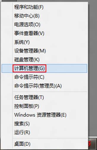 1、在 Metro 或传统桌面下,按键盘的“Win+X”组合热键调出快捷菜单,使用鼠标左键单击“计算机管理(G)”。如下图画面所示: