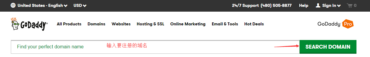一、进入Godaddy官方网站,在域名注册页面的搜索框中输入要注册的域名,或者点击导航上的“Domain”→“Domain Search”搜索域名,然后点击后面的Search Domain。
