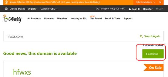 二、如果您输入的域名已经被注册的话,会提示Sorry, xxxx is already taken,你就需要换个域名了。如果您输入的域名可用的话,会提示Good news,this domain is available,点击右侧的Continue(下面的内容不用看),在godaddy域名注册的时候填写的域名一般是顶级域名,就是不带www的域名。