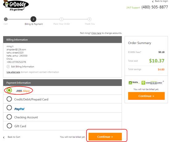 六、系统将自动跳转到支付模式选择页面,我们选择支付宝,点击“Continue”