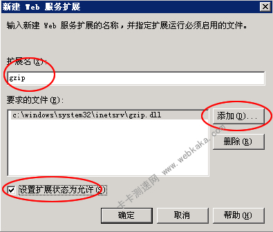2)、在弹出窗口里写上“扩展名”(名字随便无所谓),点击“添加”按钮,选择文件:c:\windows\system32\inetsrv\gzip.dll,然后把勾选“设置扩展状态为运行”,最后点击“确定”按钮。