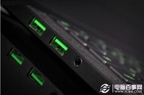 雷蛇游戏本上的USB接口也均为USB 3.0规格,但为了与机身上鲜绿色的键盘背光灯和雷蛇logo相搭配,因此将USB接口的颜色染成“绿色”,这样做也可以提高机器和品牌的辨识度,因为目前还没有任何第三方厂家采用绿色的USB接口设计。