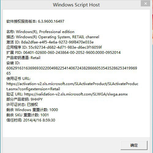 运行:slmgr.vbs -dlv 命令可以查询到Win8.1的激活信息,包括:激活ID、安装ID、激活截止日期等。