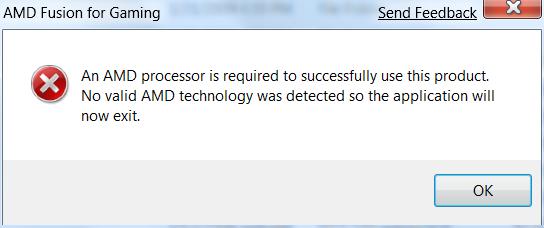 首先我们要下载AMD Fusion for Gaming的最新1.0版本,安装完毕后直接运行,如果你没有一颗AMD的“芯”的话,就会出现如下图的提示,提醒你必须使用AMD处理器的系统才能运行此程序。