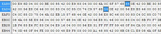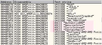 我们双击"AuthenticAMD"字符串,在新开窗口中就能看到"AuthenticAMD"字符串真实的汇编运行代码了,另外一个关键词"GenuineIntel"也就在 "AuthenticAMD"代码下面。我们双击"AuthenticAMD"和"GenuineIntel"两个字符串,可以比较出二者实际运行汇编代码的不同,一个是"PUSH AMDFusio.00420E64" (for AMD)、一个"PUSH AMDFusio.00420E54" (for Intel),我们所需要做的只是简单的将"PUSH 420E64"修改成为"PUSH 420E54"就可以了。