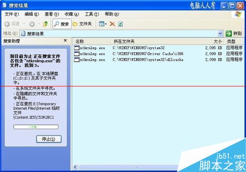 3、使用搜索找一下这个ntkrnlmp.exe文件,可能会有好几个同名文件,注意它们之间文件的大小,从而判断文件是否被毁损了。