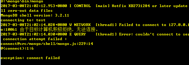 如果你没有安装在默认目录下,那么你进入bin目录下,然后启动命令行,输入mongo,回车,你会发现报错了。