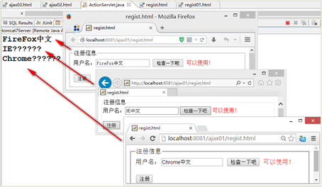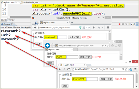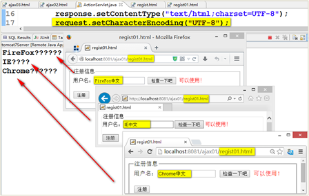 重新运行程序,分别使用Chrome、IE、FireFox浏览器来访问regist.html页面,测试中文情况,可以正确得到表单以POST方式提交的中文字符了。
