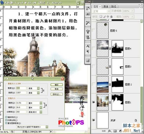 1、新建一个稍大一点的文件,打开素材图片,拖入素材图片1,按Ctrl U调用色相/饱和度降低黄色,添加图层蒙版,用黑色画笔涂抹不需要的部分。
